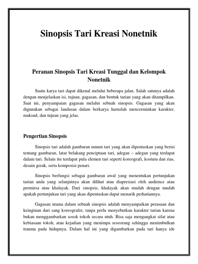 Sedangkan pengertian sinopsis menurut kbbi , sinopsis ini adalah suatu karangan ilmiah biasa digunakan bersamaan itu dengan karangan asli yang menjadi dasar sinopsis itu, sinopsis secara garis besar merupakan suatu ringkasan, abstraksi atau juga ikhtisar karangan. Pengertian sinopsis adalah sebuah ringkasan dari suatu. Secara garis besar, sinopsis merupakan abstraksi, ringkasan, atau ikhtisar dari suatu karangan. Salah satu tujuan penulisan sinopsis adalah memberikan informasi penting dari sebuah karya salah satu bentuk pentingnya pembuatan sinopsis dapat dilihat ketika kita datang ke toko buku. Menyusun sinopsis sama dengan menyusun ringkasan karangan, menyusun ringkasan karangan ibarat memangakas sebuah pohon besar menjadi pohon kecil yang padat dan berisi.